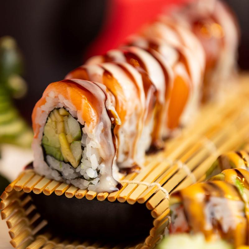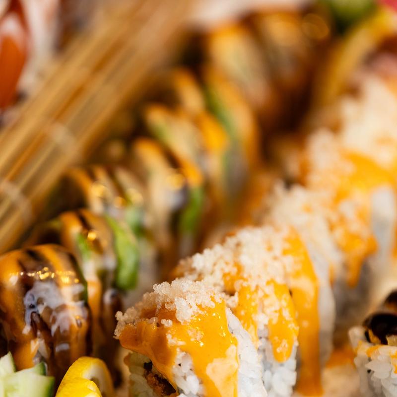 In: tempura shrimp, cream cheese, kani | Outside: avocado, eel sauce, yum yum sauce