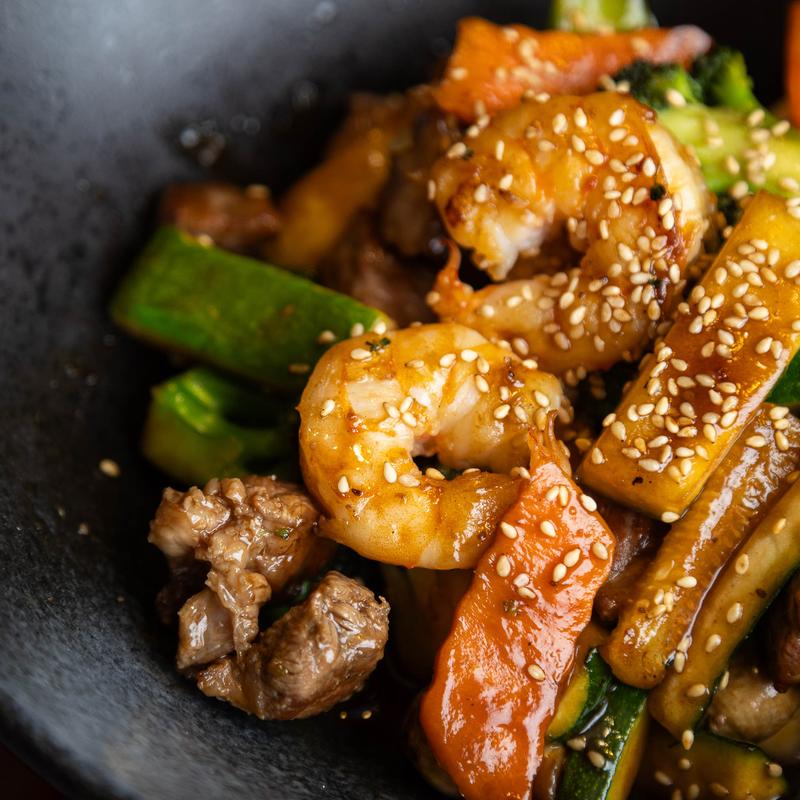 Jumbo shrimp, fresh broccoli, carrots, mushrooms, and zucchini tossed in light sesame soy sauce
