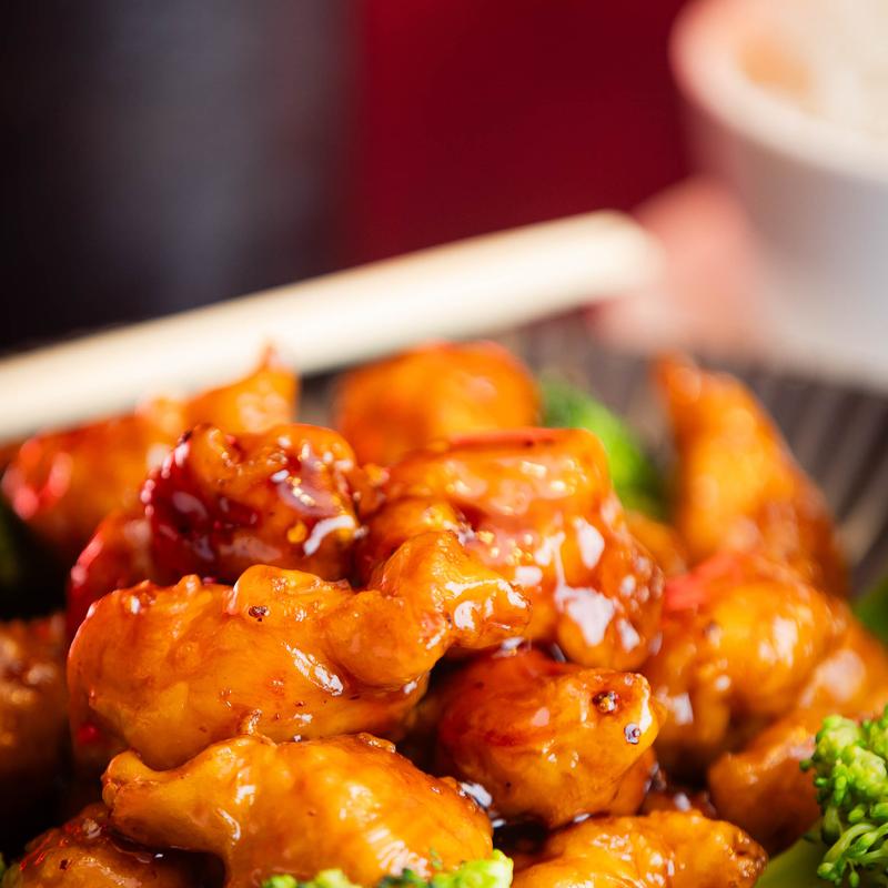 Lightly breaded premium white meat chicken in homemade spicy General Tso’s sauce
